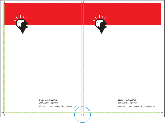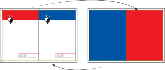 Deblja puna crna linija označava dimenzije tabaka ( 45x32 cm ). Isprekidana crna linija označava format A4 sa bleedingom od 3 mm ( 21.6x30.3 cm ). Isprekidana zelena linija označava konačni format A4. Cajtne su tu, jel’da, da nam kažu kuda treba da sečemo. Obavezno sve što radite, pravite na dva reza - obeleženo plavim krugom. Dakle, i A3 sa bleedingom i A4 i pozivnice i flayere i vizitkarte... sve. Kod obostrane štampe postoje dve mogućnosti za okretanje tabaka: oko duže ili oko kraće strane. U oba slučaja sve funkcioniše isto, na vama je da se opredelite šta vam više odgovara, u odnosu na format onoga što štampate. Dakle, birate između portrait ili landscape orijentacije strane. U gornjem primeru, tabaku smo dali landscape orijentaciju, jer bi bilo blesavo da izvrćemo glavu na levo ili desno u nastojanju da pročitamo da li smo dobro napisali adresu u dnu strane. Jel’da? Ono o čemu treba voditi računa je da poleđina onoga što se nalazi gore levo na prednjoj strani, će biti gore desno na zadnjoj. U našem primeru, strana koja ima crveno zaglavlje ima crvenu pozadinu, plava - plavu.