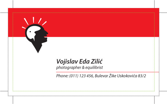 Vizit karte Vizit karte štampamo u različitim formatima - standard je 9x5 cm. Da bi vizit karta bila dobro isečena, i/ili odštampana neophodno je napraviti bleeding ( prepust, margo, obrez, ili već kako ko to zove ) od 3 mm sa svake strane. Dakle, sve što treba da ide do ivice vizit karte od 9x5 cm ( slika, boja, linije... ), mora da ide i u bleeding do 9.6x5.6 cm ( u ovom slučaju crvena boja podloge i linija ). Vodite računa da tekst ( i sve drugo što vam je srcu drago ) bude uvučeno barem 3 mm od linije sečenja. Sve što važi za format 9x5, važi i za bilo koji drugi format vizitkarte. Veličina fajla koji treba doneti: 9.6 x 5.6 cm ( + cajtne )